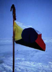 drapeau de la Terre, fixés à la dragonne de nos batons de ski plantés dans le sol.